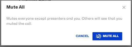 We provide a feature that allows you to “mute all” participants (except presenters and you) in a room with one click. This button can be found on the right-hand side by clicking the Participants button. The “mute all” feature is helpful when someone in the meeting is causing background noise and you want to get a point across quickly without disruption. All participants on the call will be notified that they've been muted.